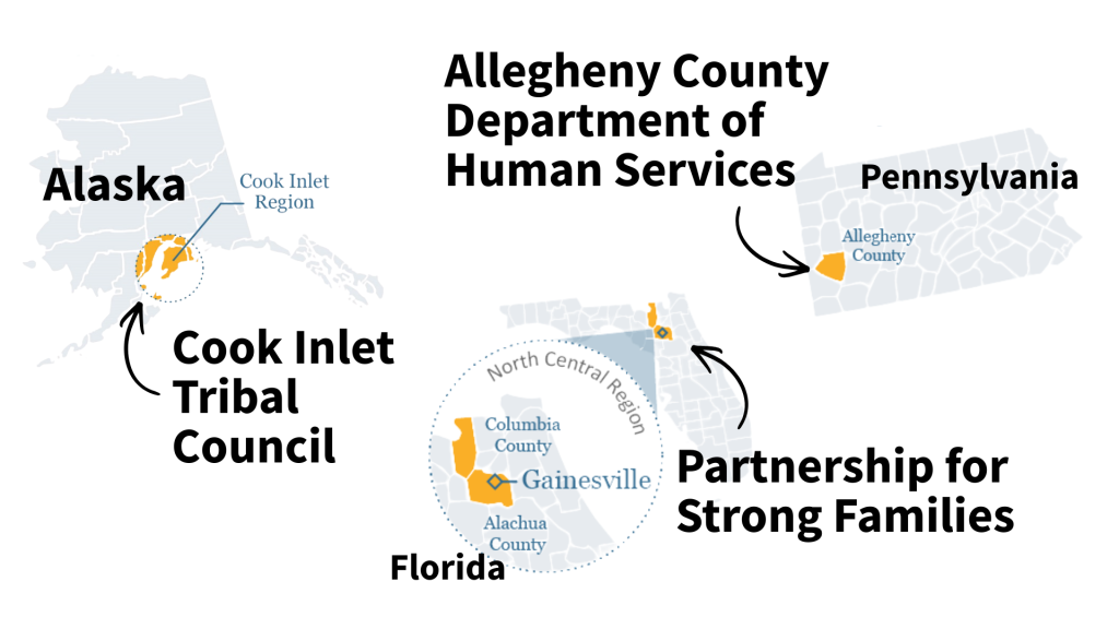The three grantee profiles retold here: Cook Inlet Tribal Council, Inc. (OPRE Report 2024-084); Allegheny County Department of Human Services (OPRE Report 2024-266); Partnership for Strong Families, Inc. (OPRE Report 2024-271). The cross-site executive summary: OPRE Report 2024-361.